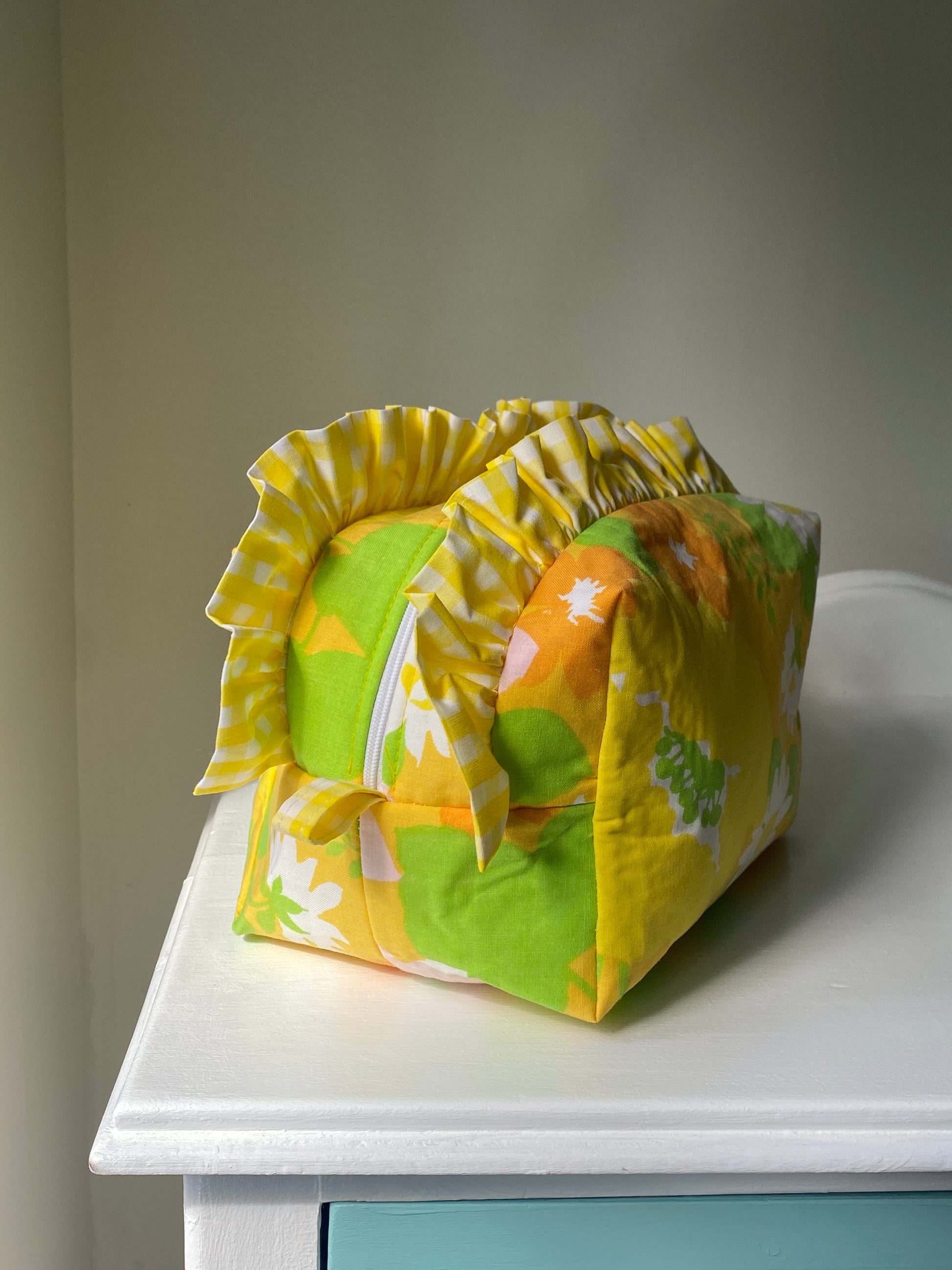 The outer fabrics are a yellow, orange and yellow floral print and a yellow check.