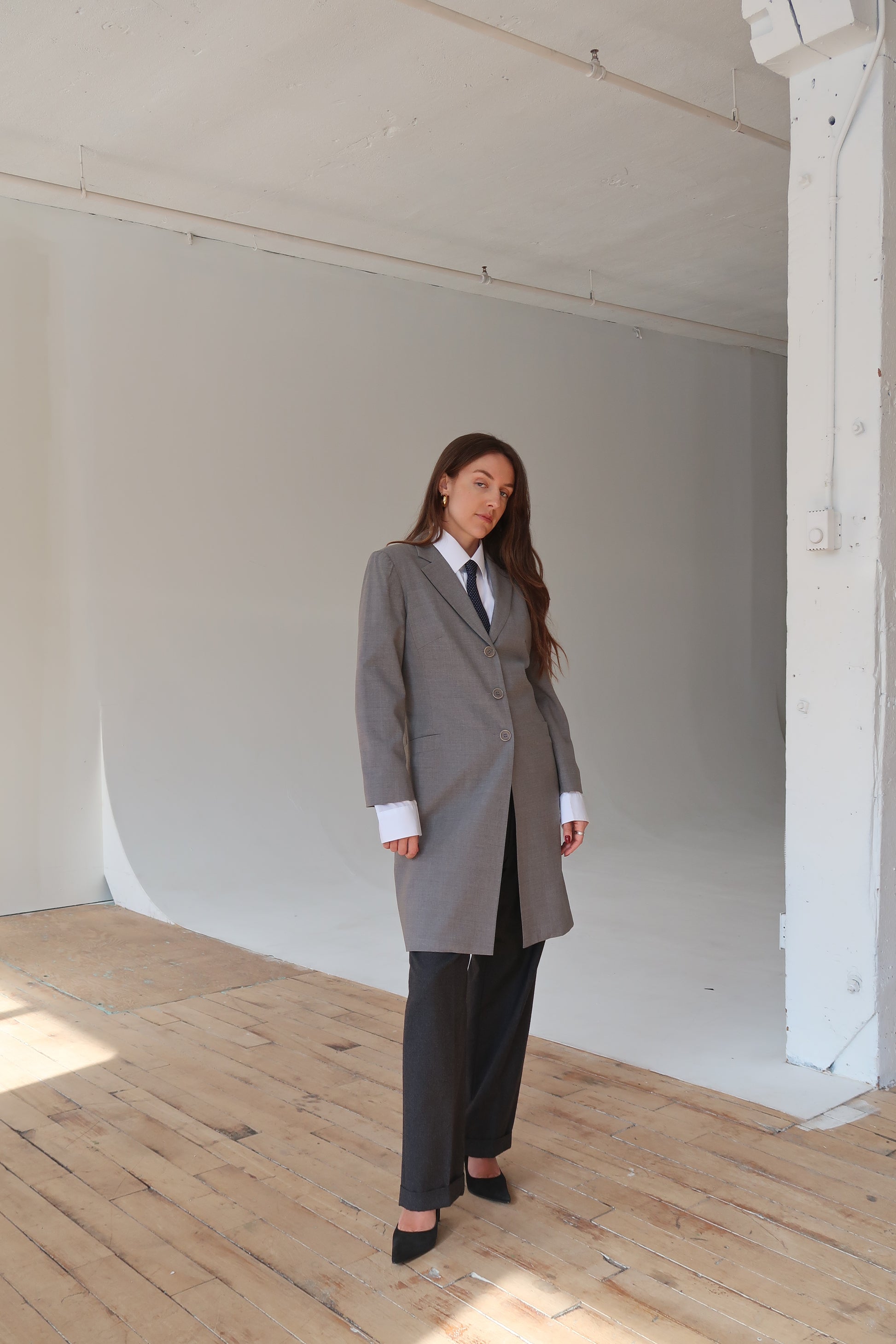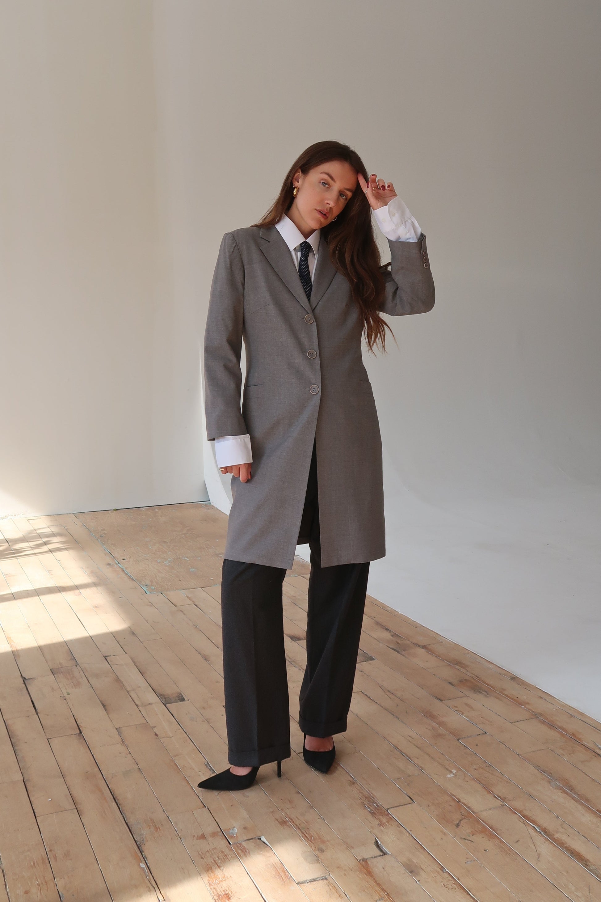 Add a touch of timeless sophistication to your wardrobe with this vintage late 90s Holt Renfrew grey jacket. Designed with a relaxed fit and a stylish slit in the back, this jacket is perfect for layering over any outfit.