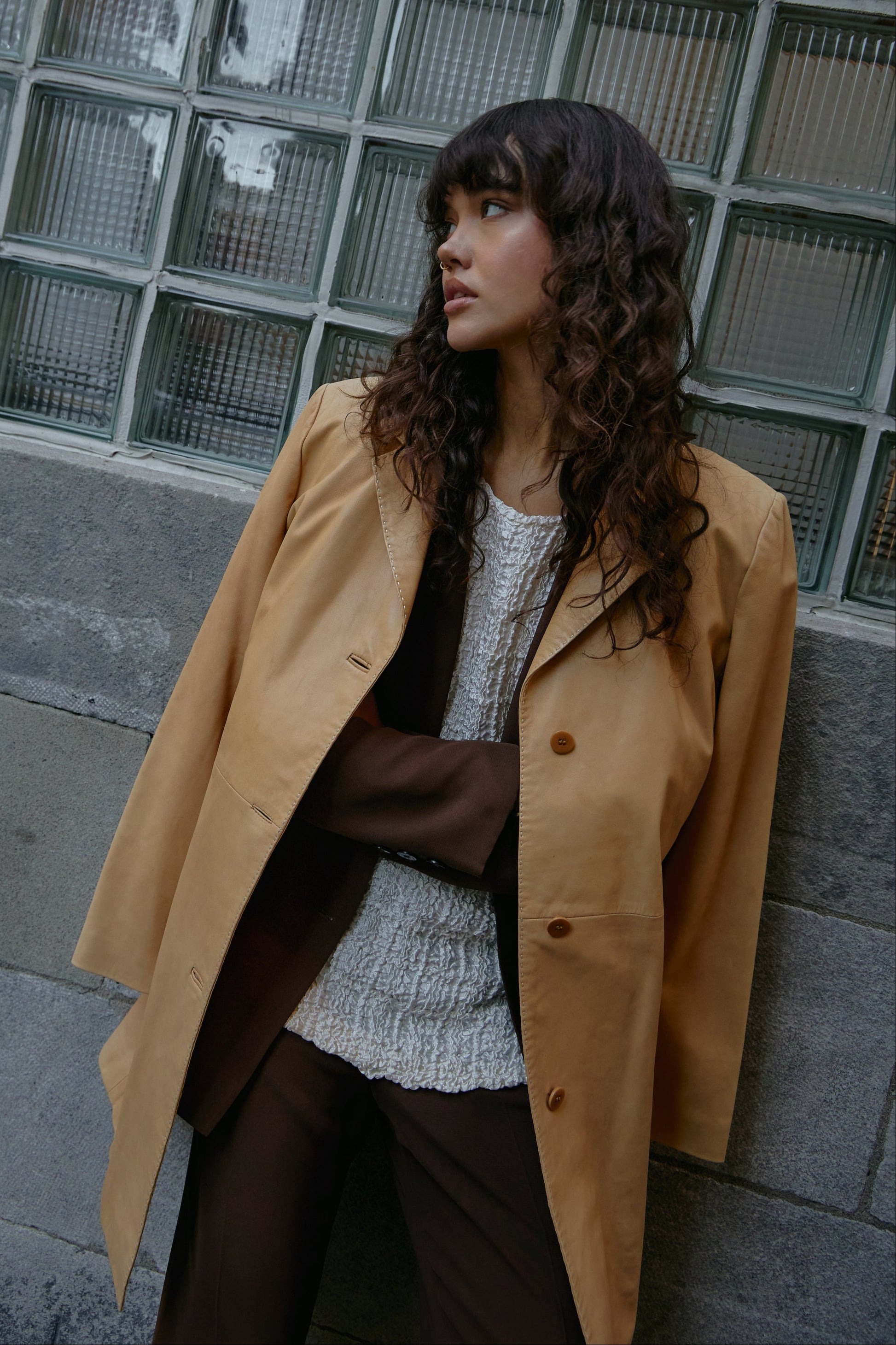 This buttery soft vintage beige leather jacket is crafted from soft genuine leather in a clean, structured silhouette. With its 90s-inspired minimalist design, sharp lapels, and button-front closure, this jacket brings both polish and edge to any outfit. The neutral tone makes it a staple for transitional weather.