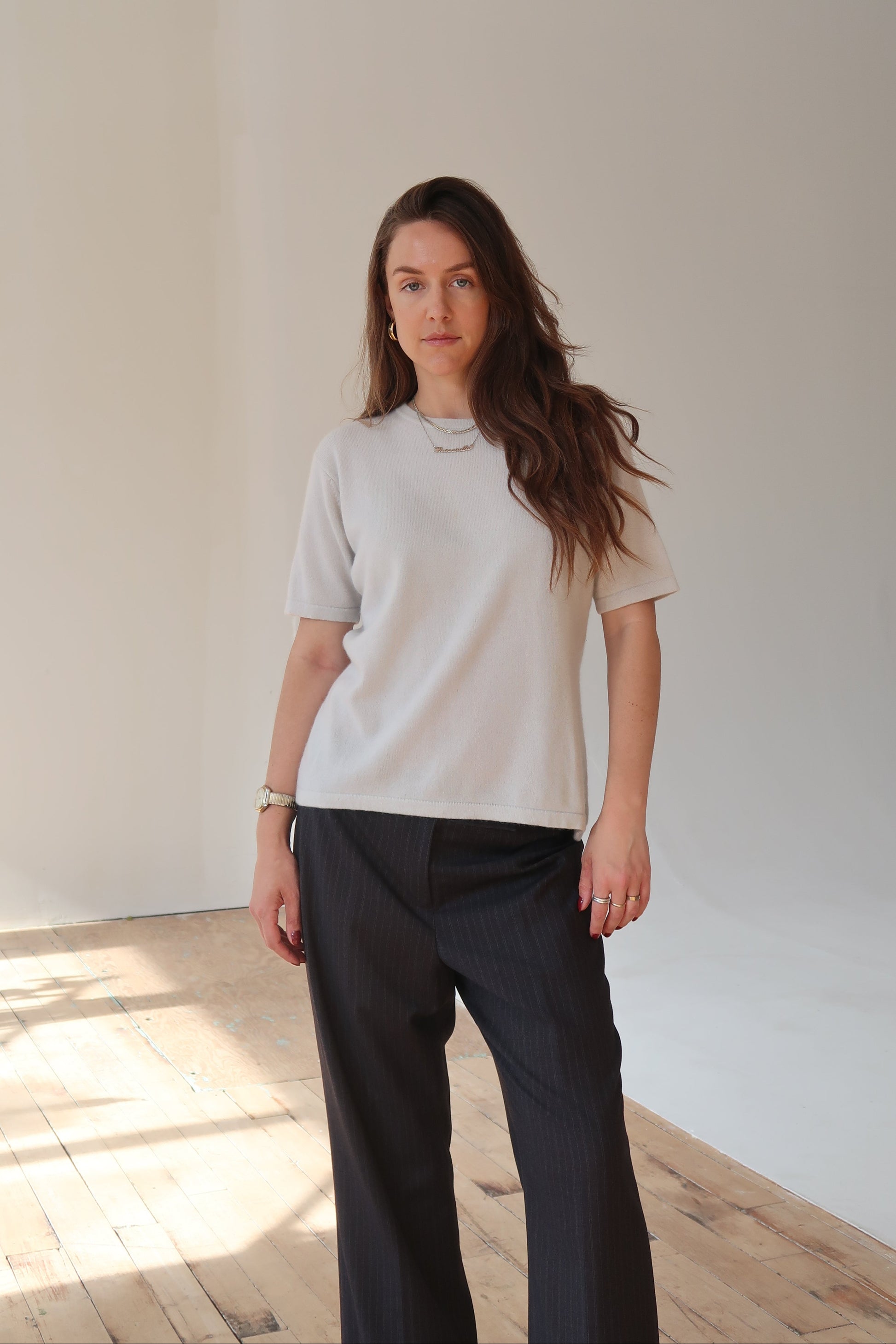 Stay cozy, stylish, and professional with this vintage cashmere boxy fit t-shirt in a serene seafoam green/grey shade. Made from 100% luxurious cashmere, this short-sleeved top from THE WORK Connection offers exceptional comfort and quality, perfect for those who value premium vintage knitwear.
