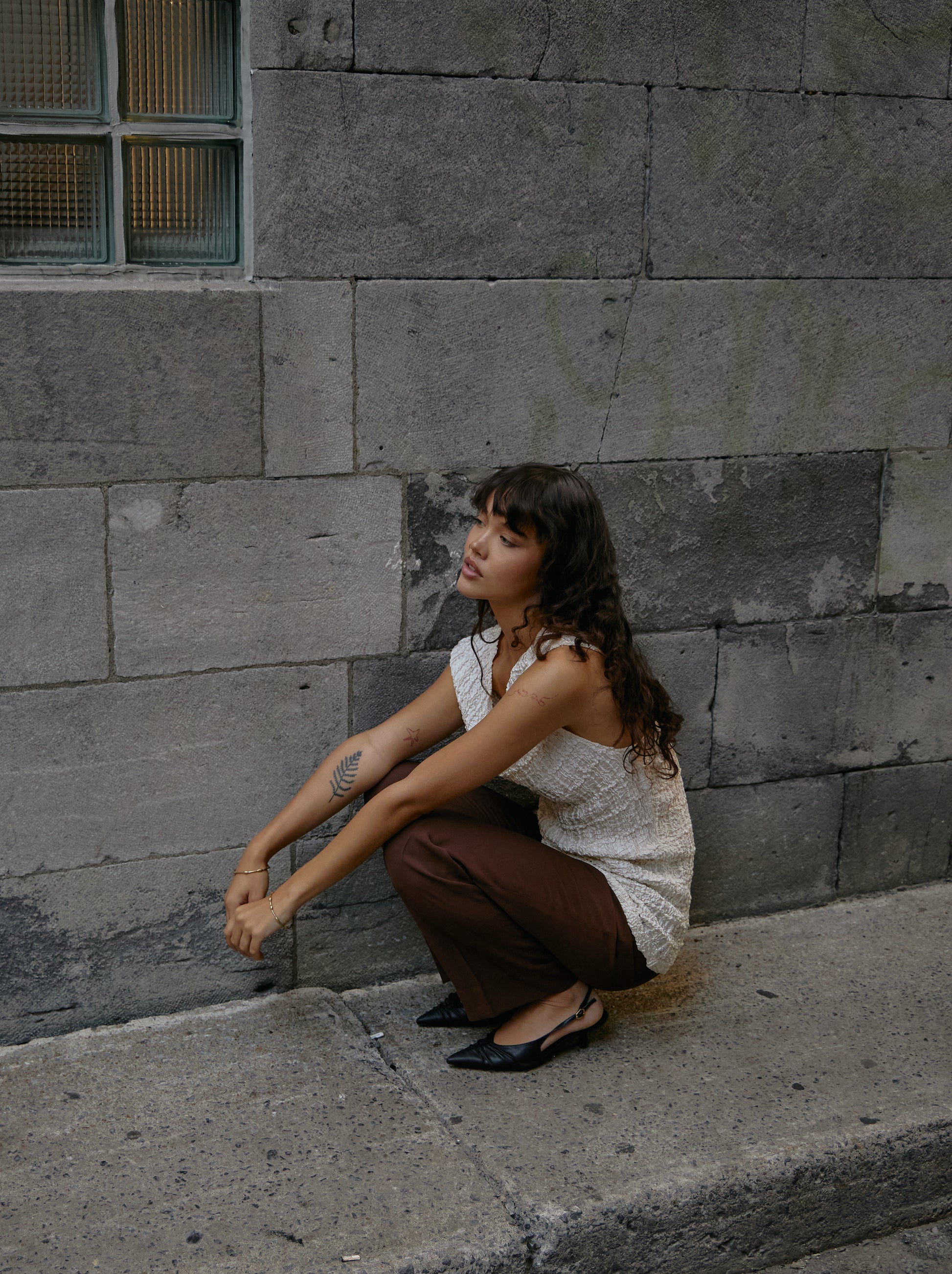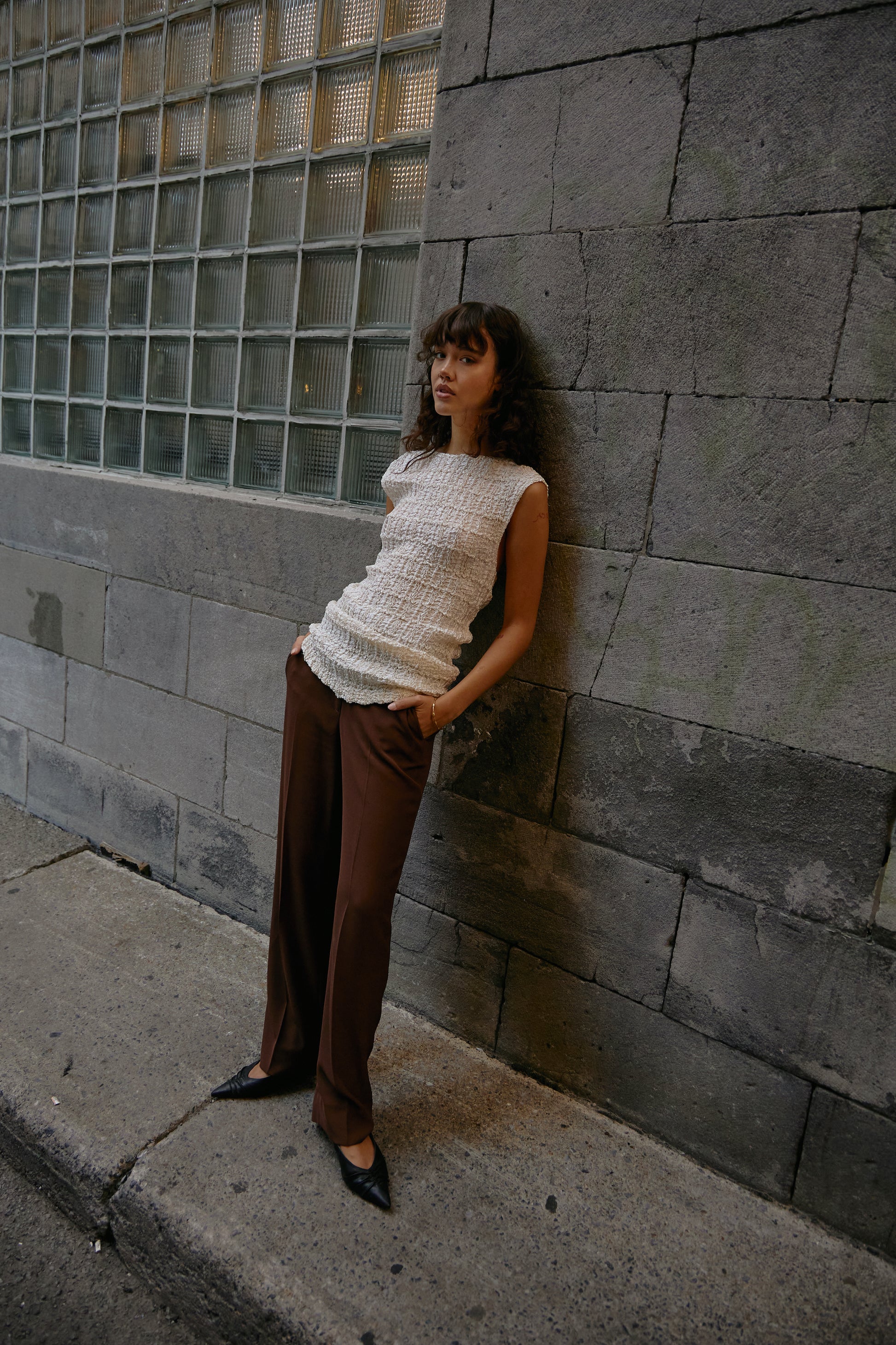 Unique vintage one-of-one textured fabric sleeveless top in an off-white colour.