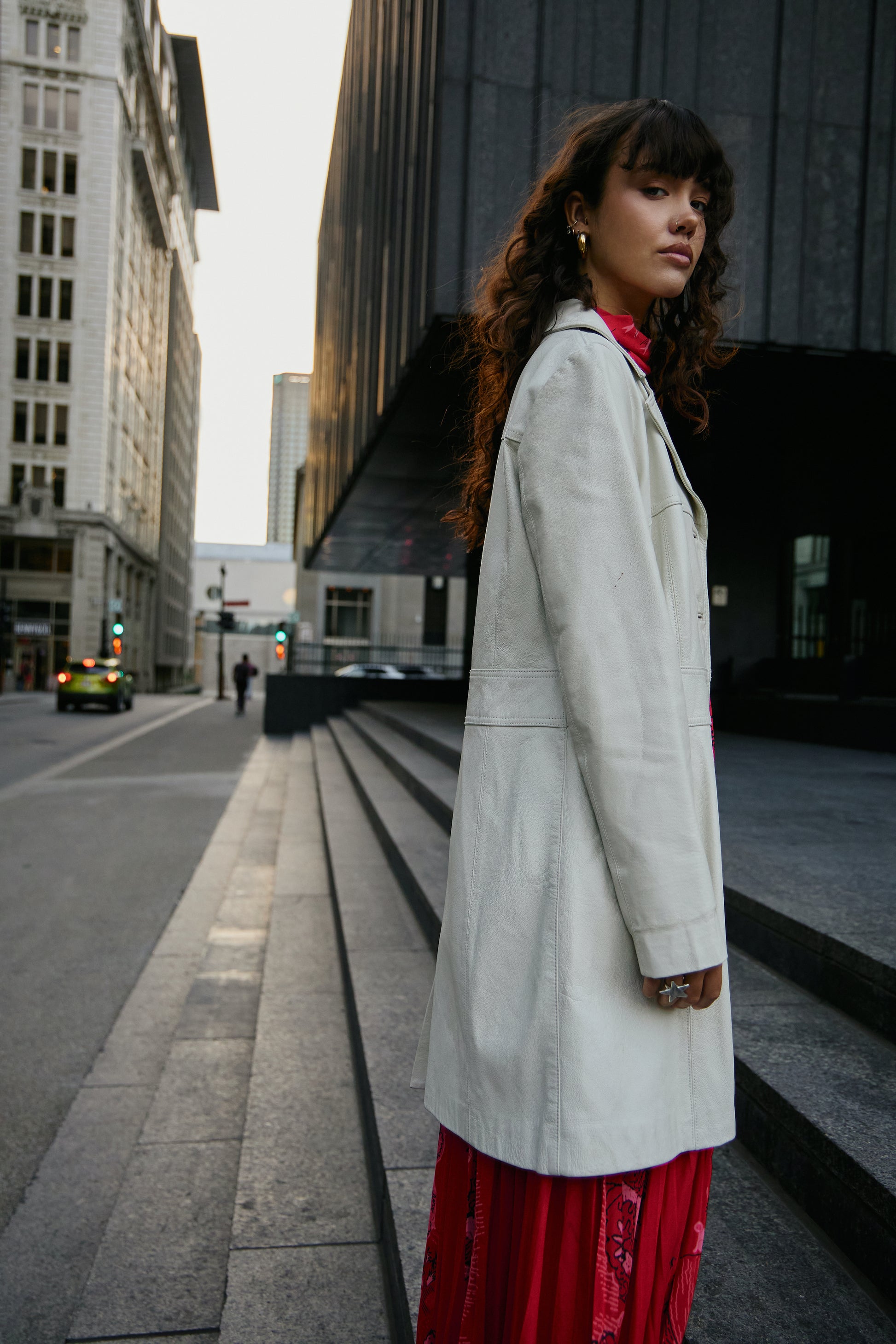 Y2K vintage white leather jacket, featuring covered leather buttons and a tailored fit. This leather jacket offers a sophisticated silhouette that flatters and elevates any look.