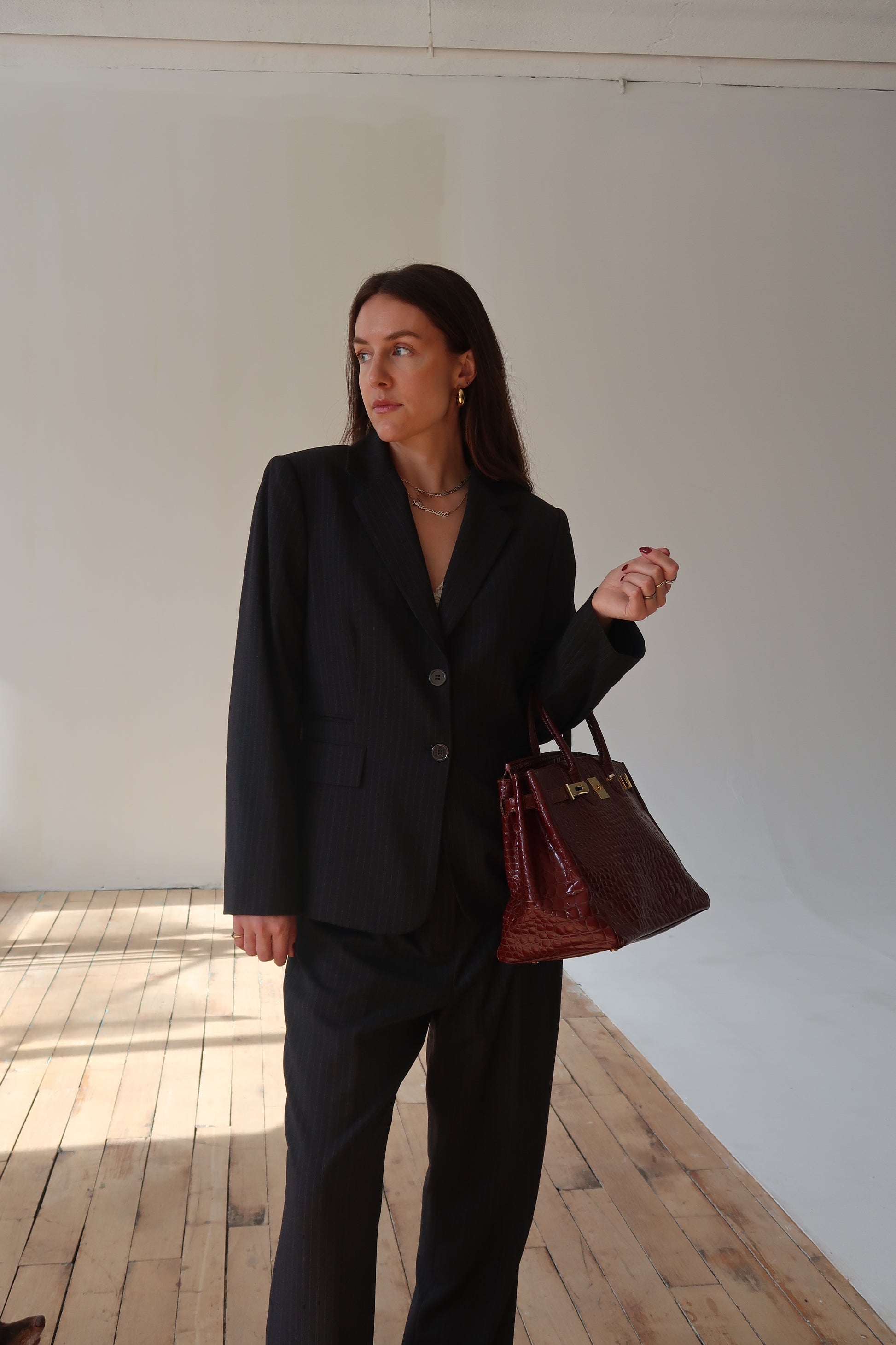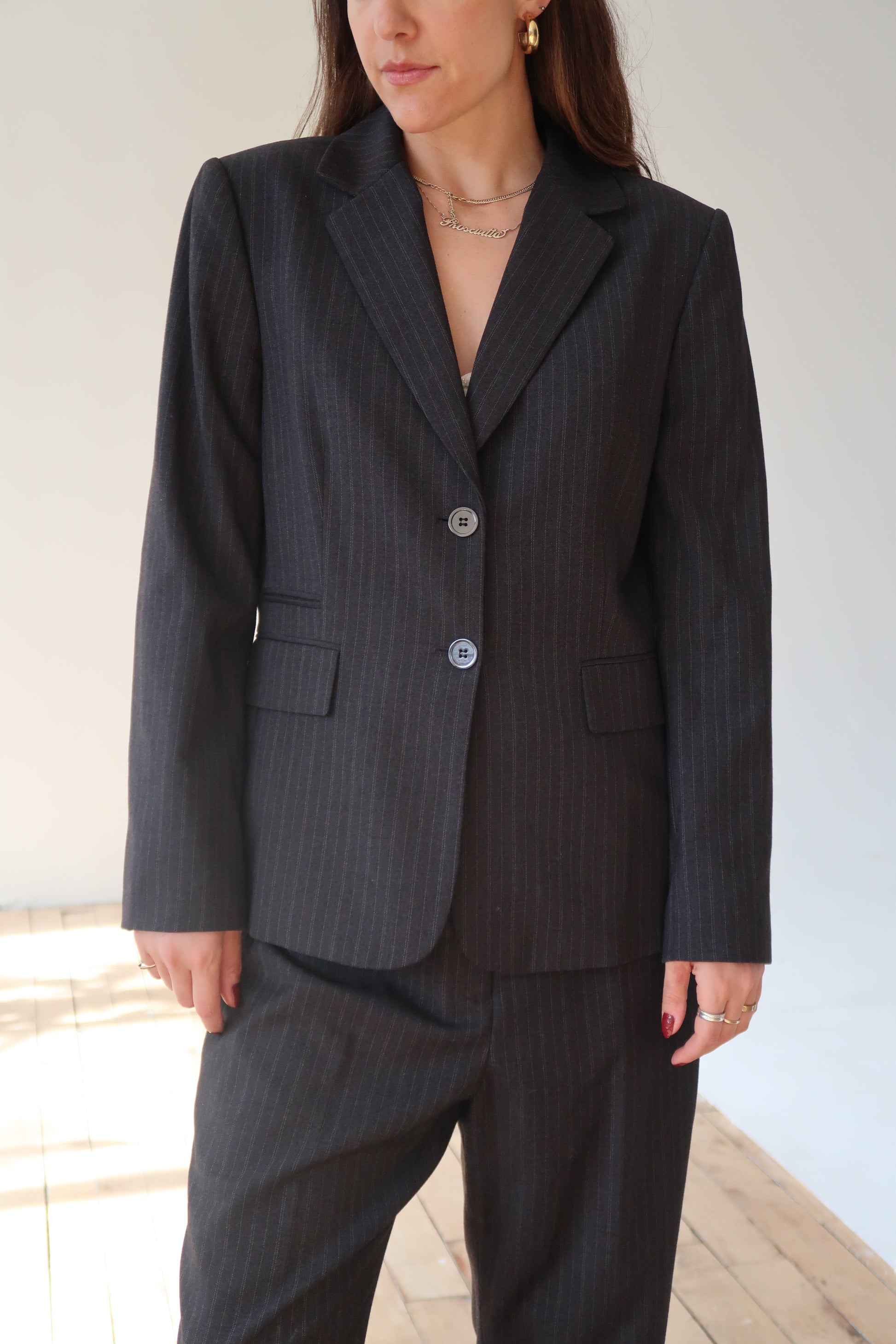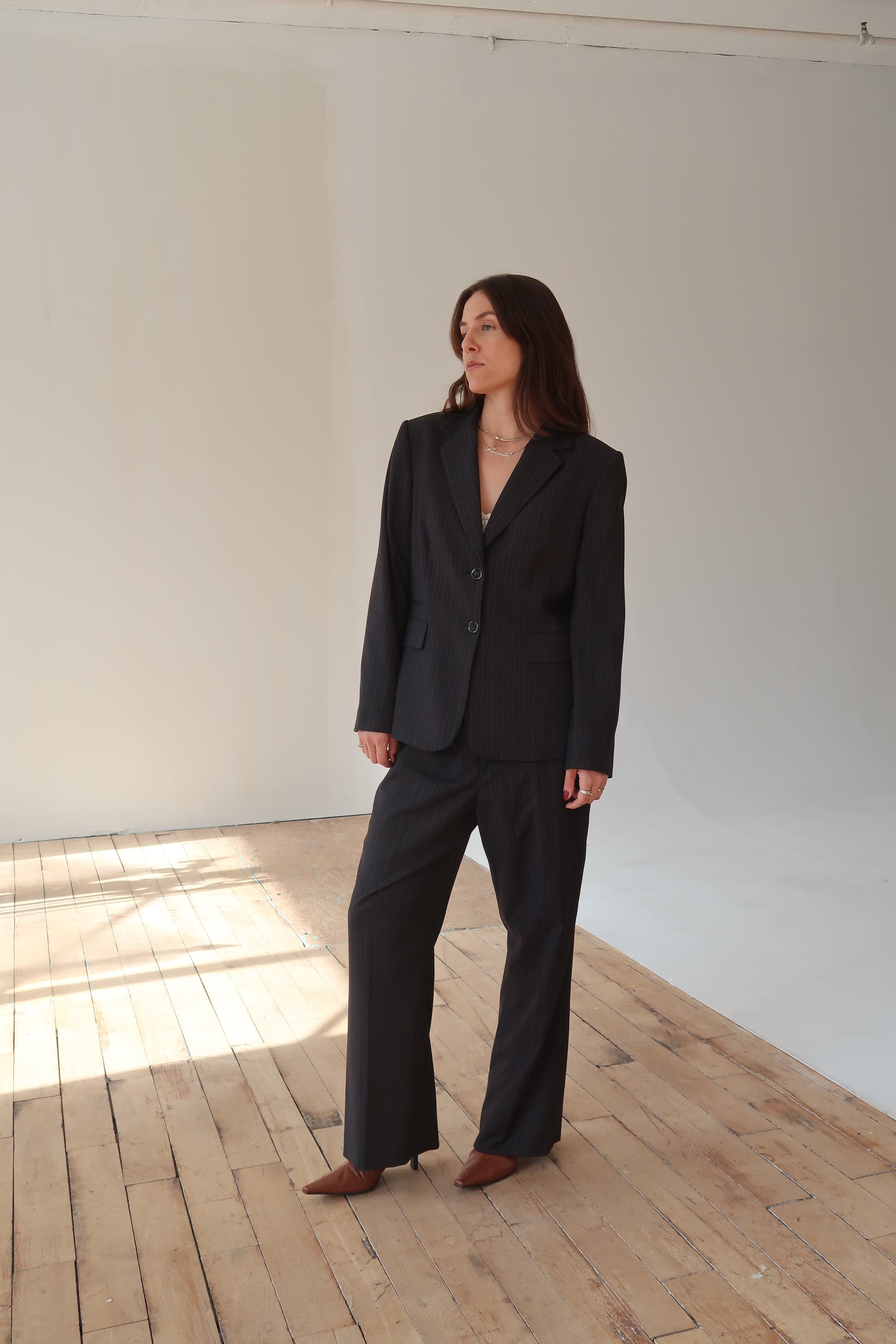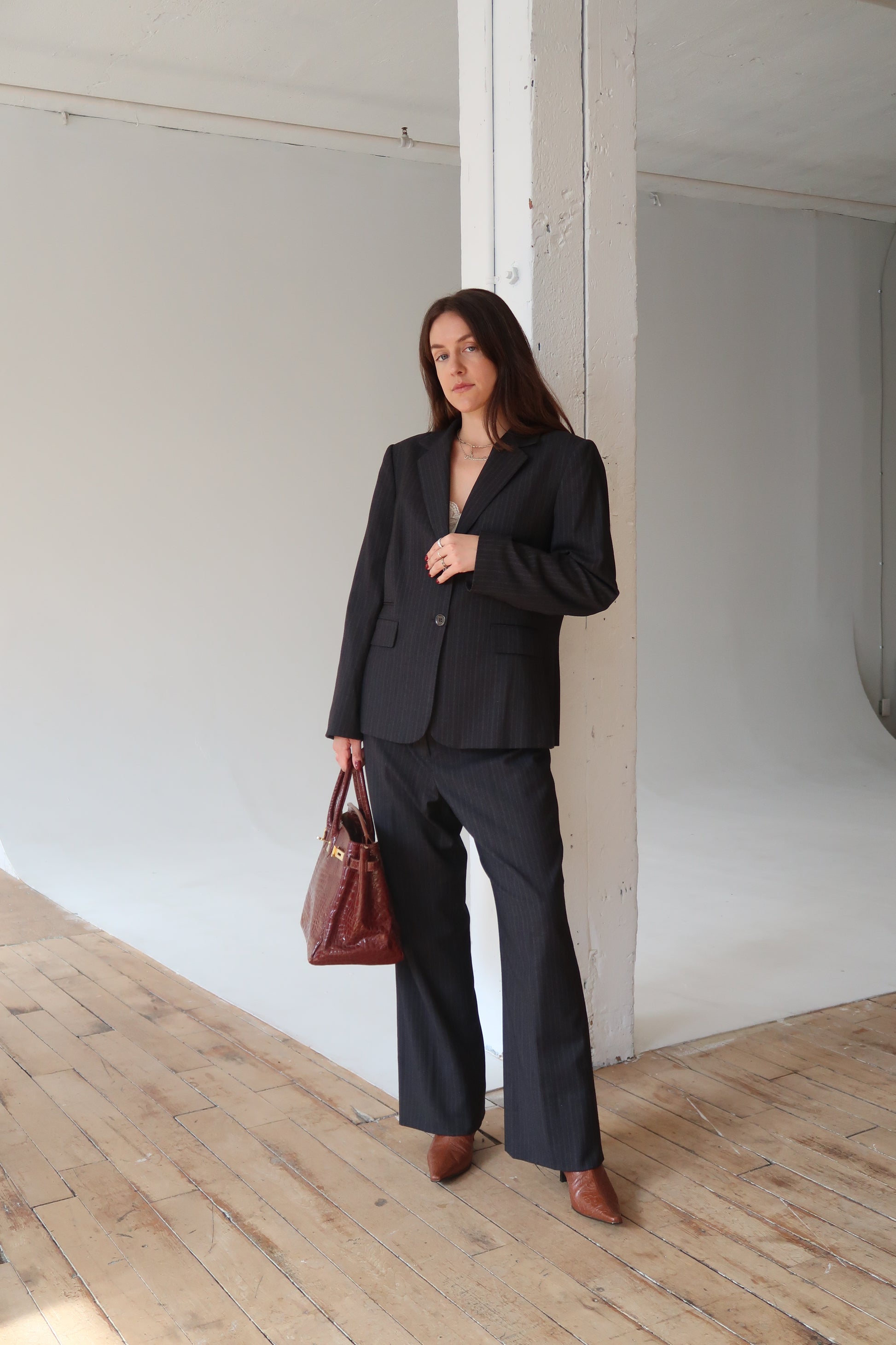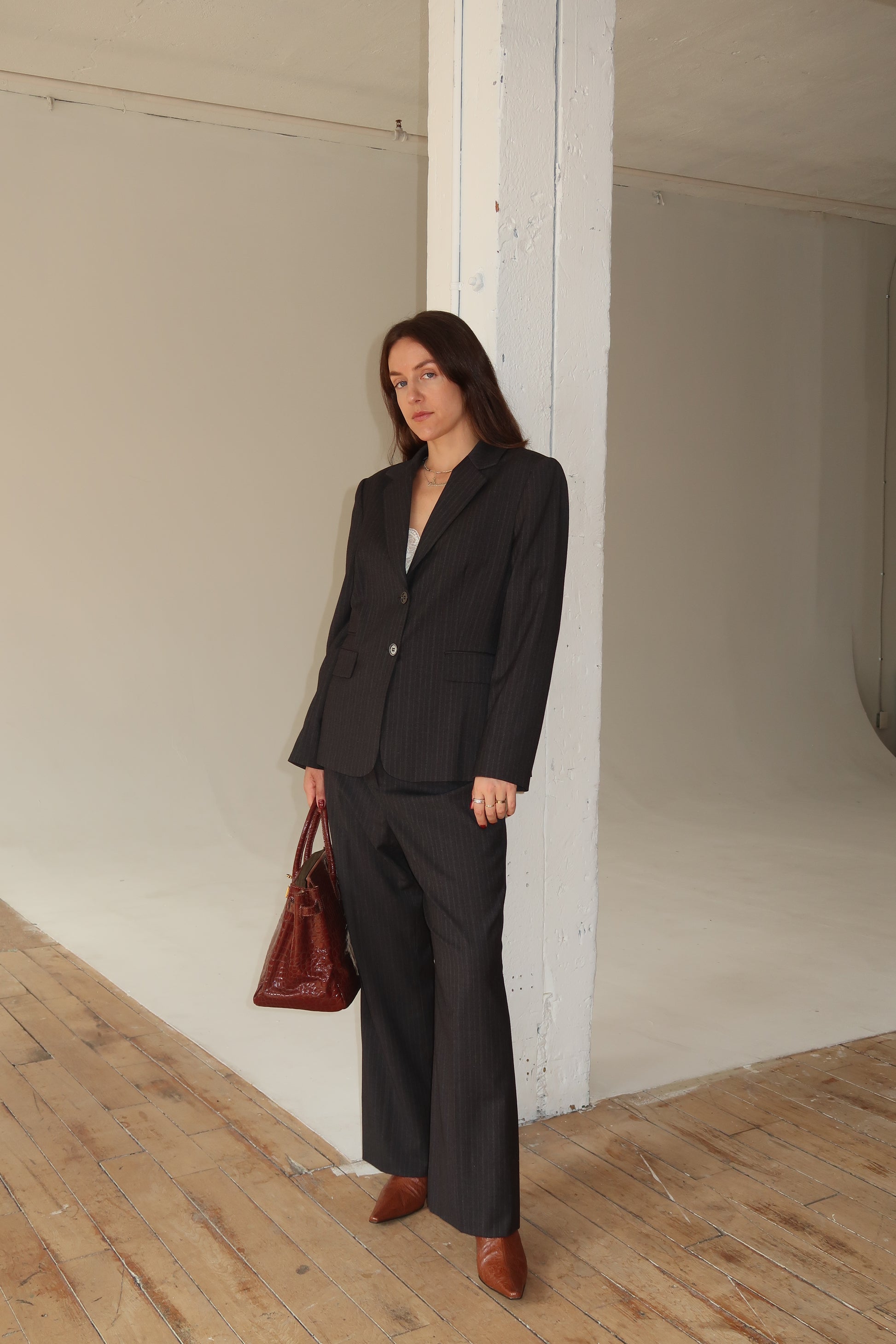 This vintage early 2000s TAHARI suit is a must-have for the modern professional who appreciates classic, sophisticated style. The deep charcoal grey colour, combined with subtle vertical stripes, adds elegance and sophistication to this two-piece ensemble. The suit gives you a flattering, tailored fit.